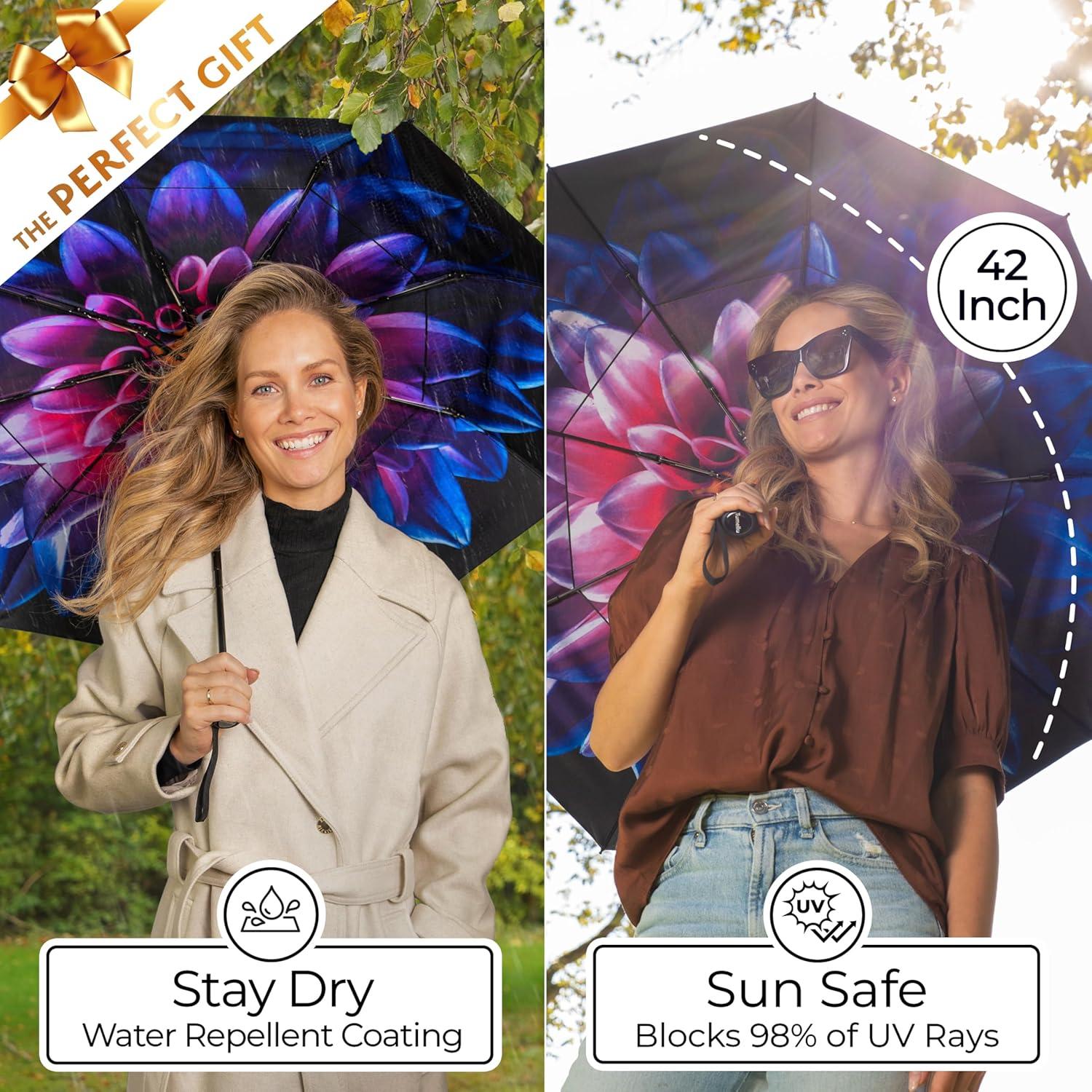 TUMELLA Strongest Windproof Travel Umbrella (Compact, Superior & Beautiful), Small Strong but Light Portable and Automatic Folding Rain Umbrella, Durable Premium Grip, Fits Car & Backpack(1-pack Purple Dahlia)